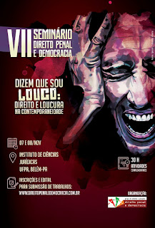 O Grupo de Estudos e Pesquisas “Direito Penal e Democracia” organiza neste ano o “VII SEMINÁRIO DIREITO PENAL E DEMOCRACIA – DIZEM QUE SOU LOUCO: DIREITO E LOUCURA NA CONTEMPORANEIDADE”, que ocorrerá na Cidade de Belém-PA, na Faculdade de Direito do Instituto de Ciências Jurídicas da Universidade Federal do Pará, nos dias 07 e 08 de Novembro de 2018.
