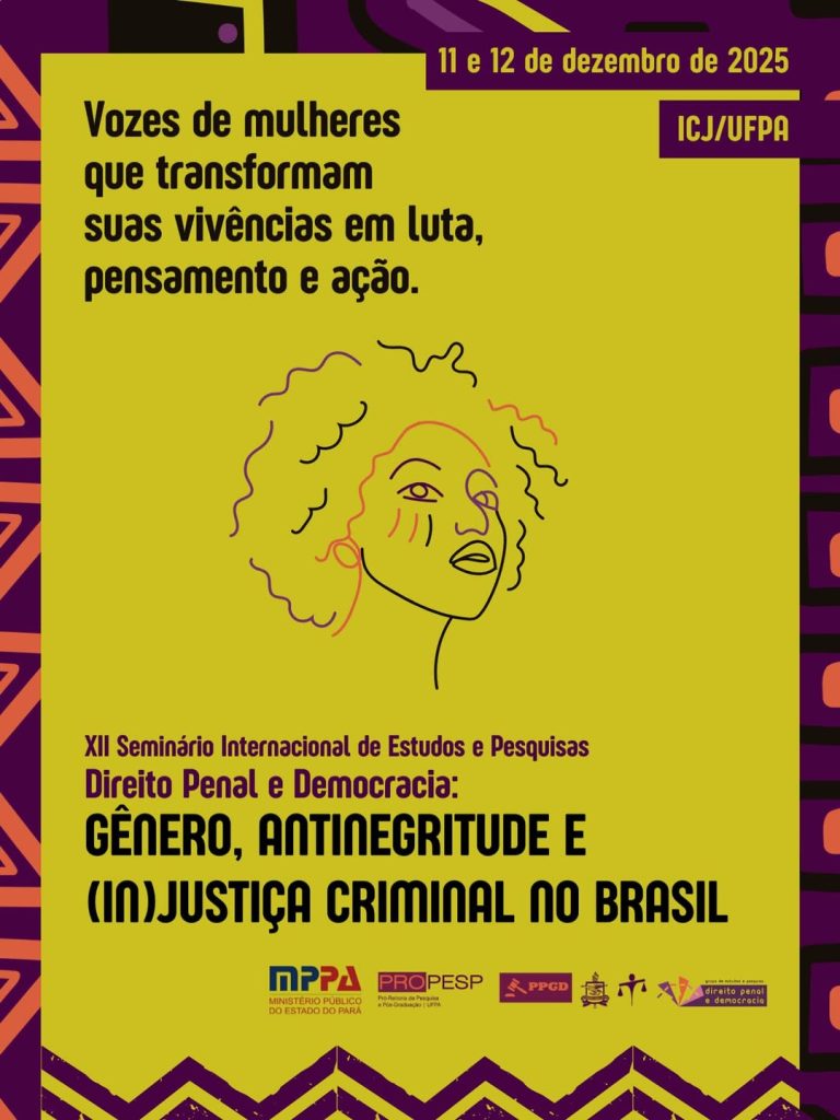 Nos dias 11 e 12 de dezembro de 2025, o Instituto de Ciências Jurídicas da Universidade Federal do Pará (ICJ/UFPA) realizará o XII Seminário Internacional de Estudos e Pesquisas em Direito Penal e Democracia, com o tema: “Gênero, Antinegritude e (In)justiça Criminal no Brasil”.