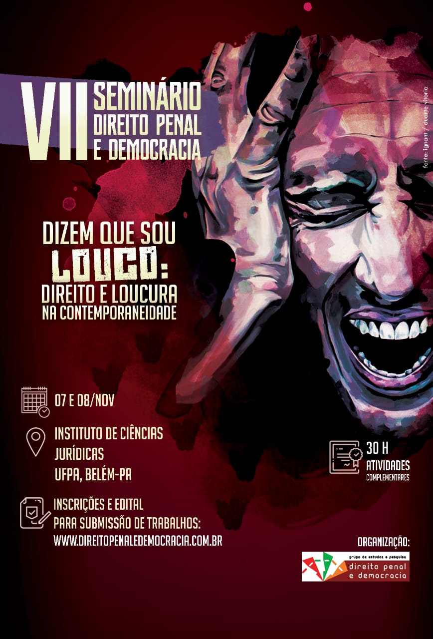 O Grupo de Estudos e Pesquisas “Direito Penal e Democracia” resolve tornar público o presente edital de seleção de trabalhos para o “VII SEMINÁRIO DIREITO PENAL E DEMOCRACIA – DIZEM QUE SOU LOUCO: DIREITO E LOUCURA NA CONTEMPORANEIDADE”, que ocorrerá na Cidade de Belém-PA, na Faculdade de Direito do Instituto de Ciências Jurídicas da Universidade Federal do Pará, nos dias 07 e 08 de Novembro de 2018.